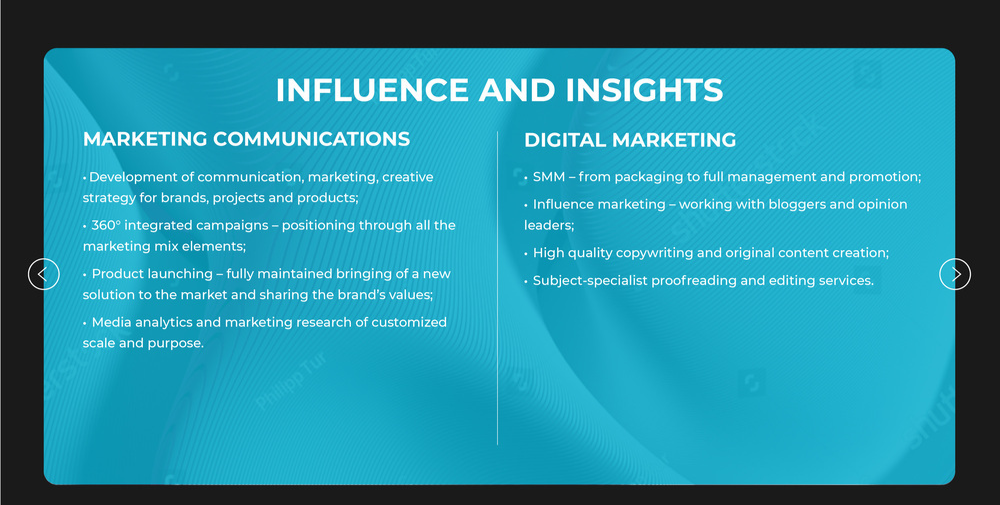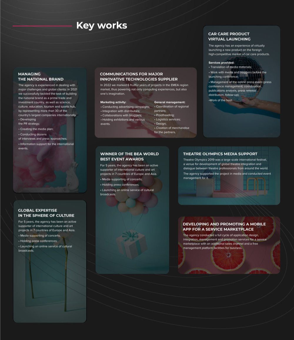We do not offer standard and generic options, but work with each client to develop the most effective strategy for achieving their goals. The agency employs professionals who ensure the top-notch implementation of turnkey projects.